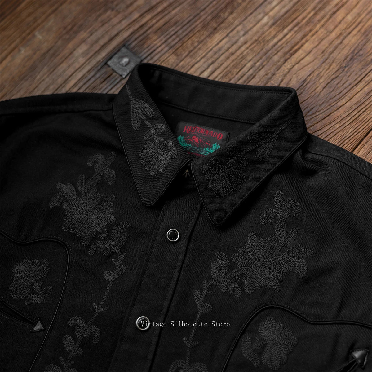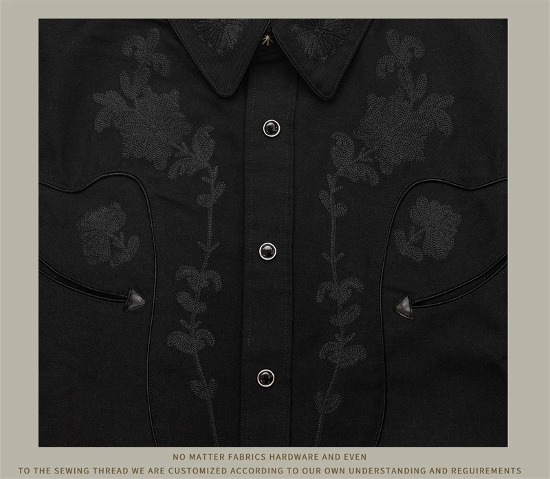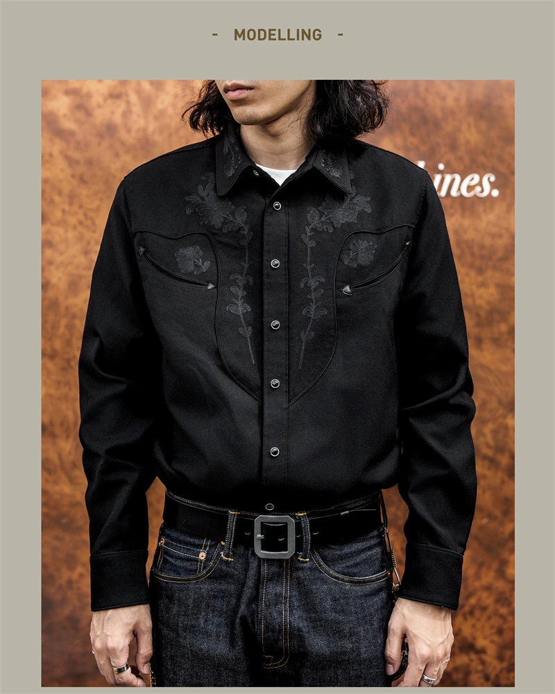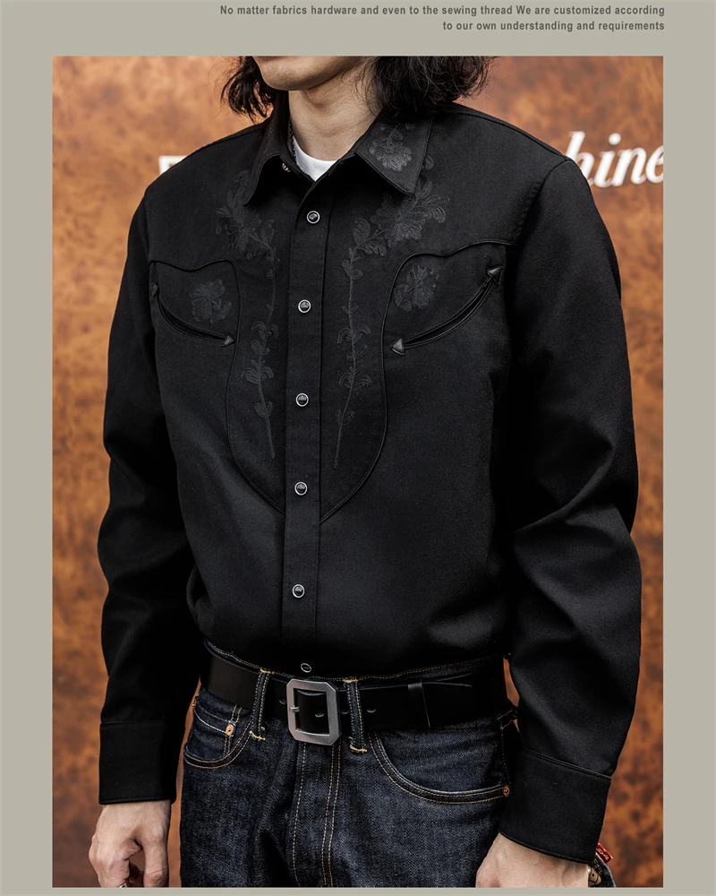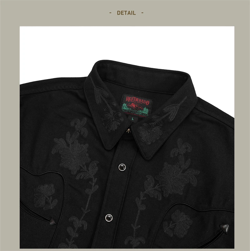 Red Tornado Floral Embroidery Musician Shirt in Black Western Style Rockabilly Country Workshirt for Men