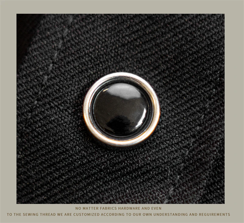 - Signature metal button at the front neck