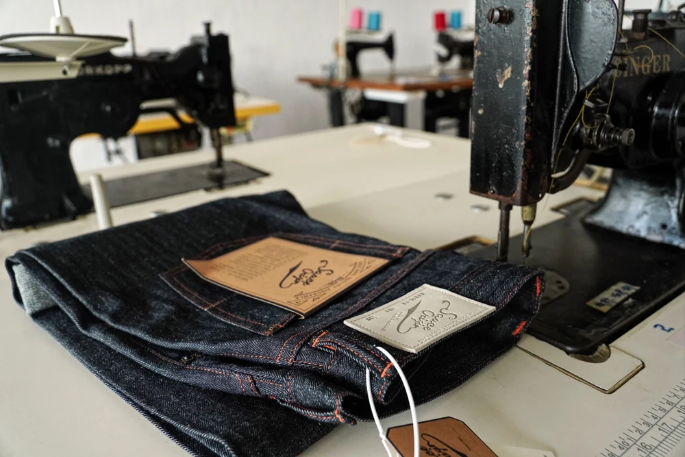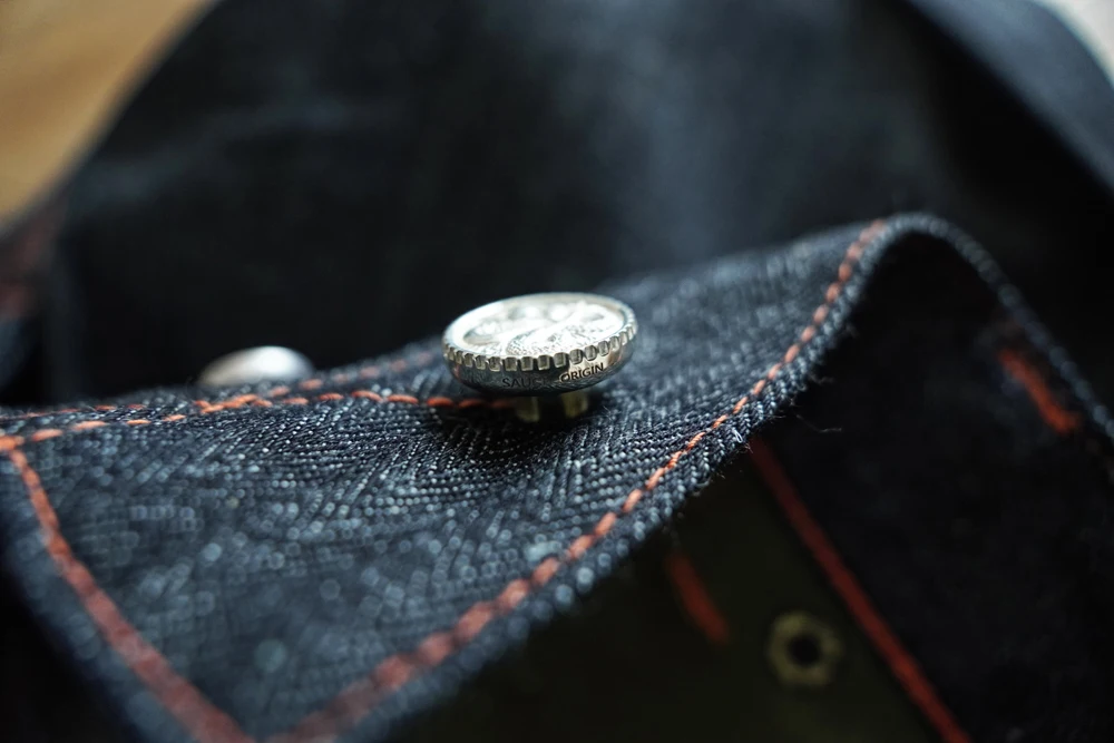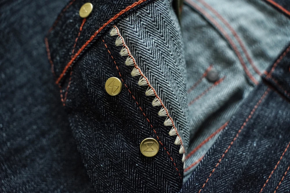 Every pair is sewn with premium Japanese GUNZE thread and meticulously crafted in our vintage-machine workshop, employing numerous rare machines from the 1940s–1960s. The detailing is exceptionally rich—examples include shell-pattern stitching on the fly and the rare “又” character stitch on the pockets—both distinctive techniques only possible on these antique machines.
