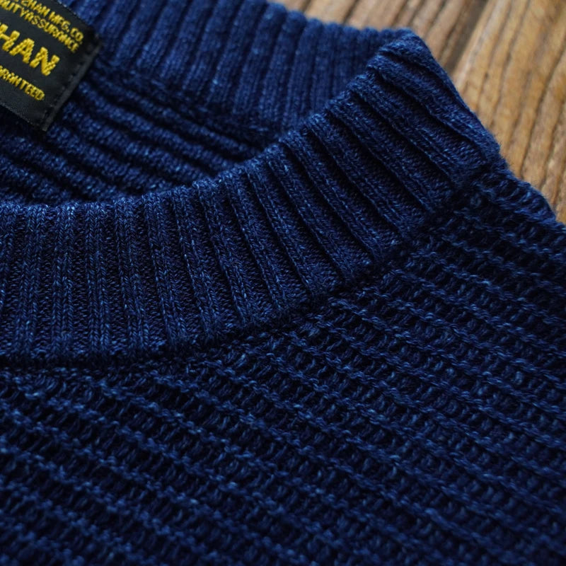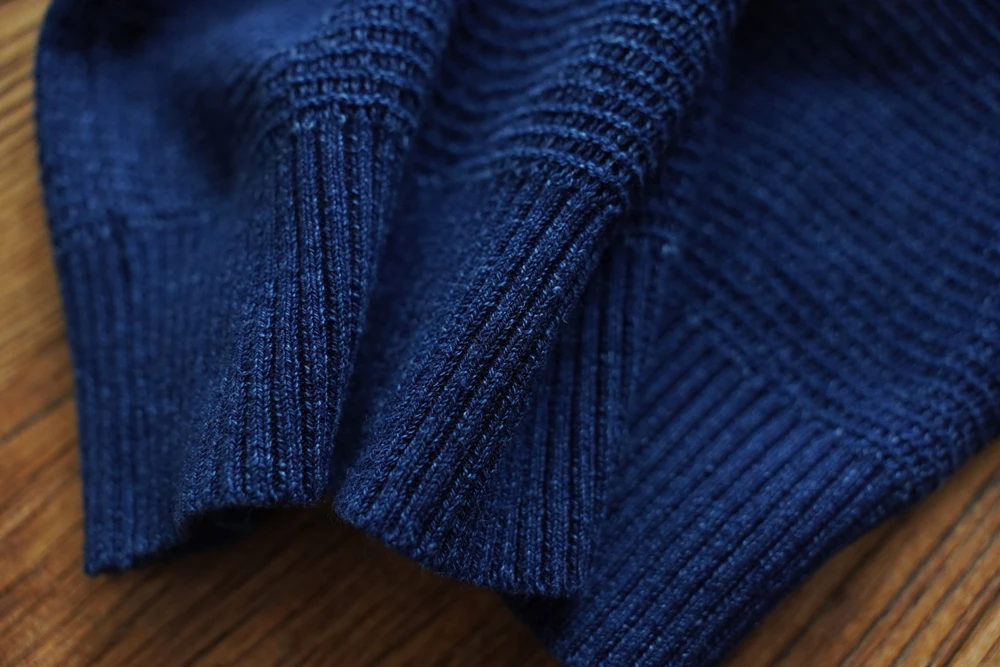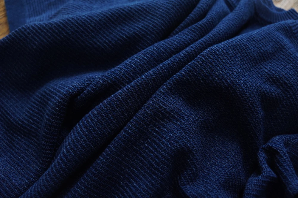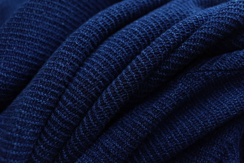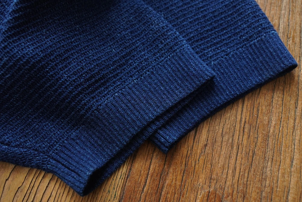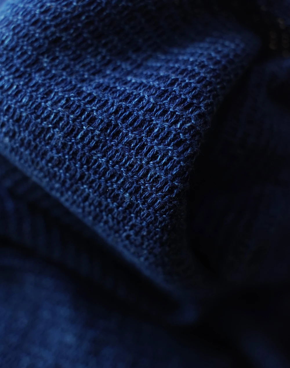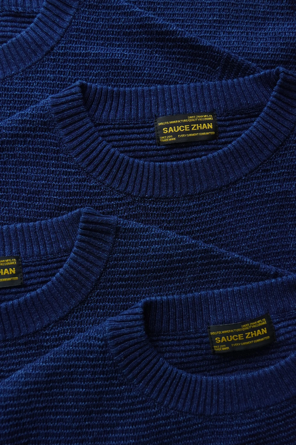 Crafted with indigo-dyed yarn using a denim-inspired dyeing technique, this knitted T-shirt is designed to age beautifully over time. After dyeing, the garment undergoes a special wash to create a rich, vintage-faded effect with a lived-in look.