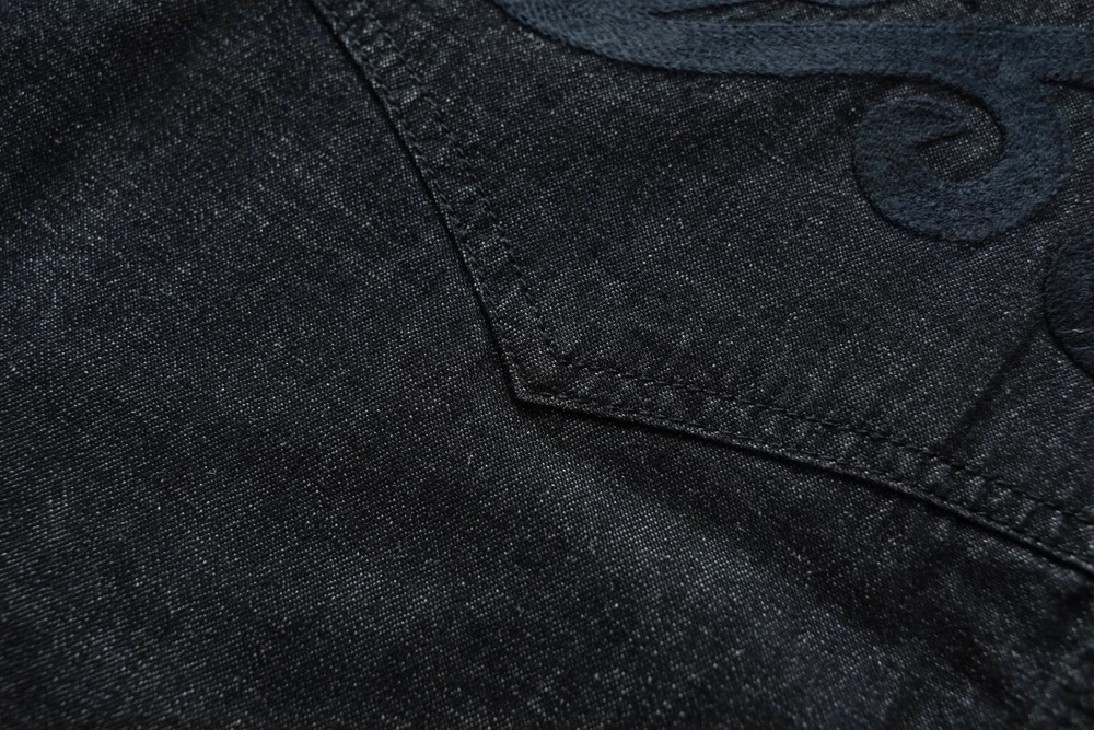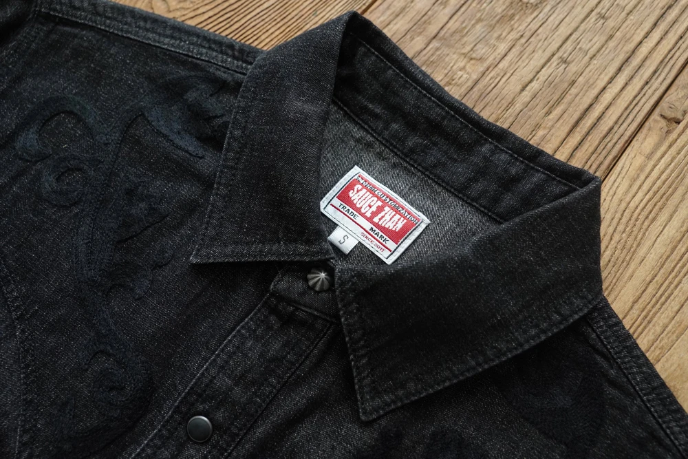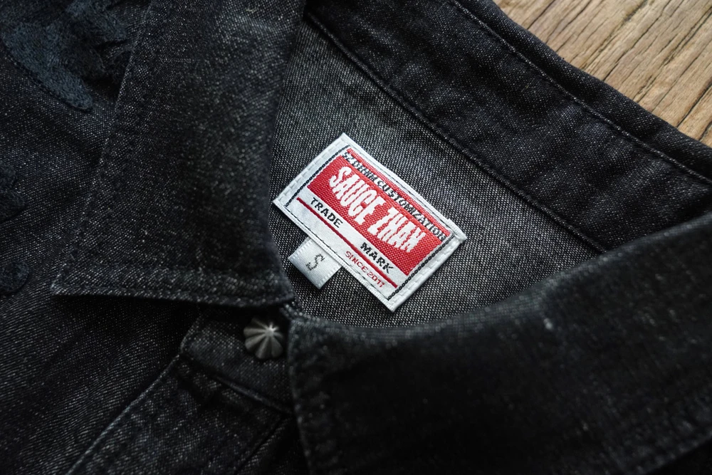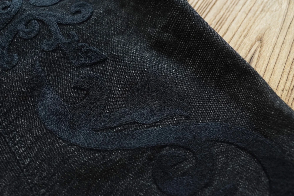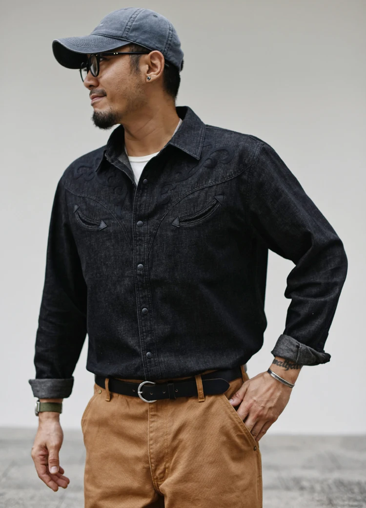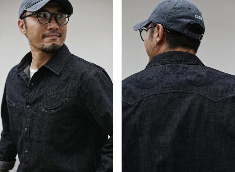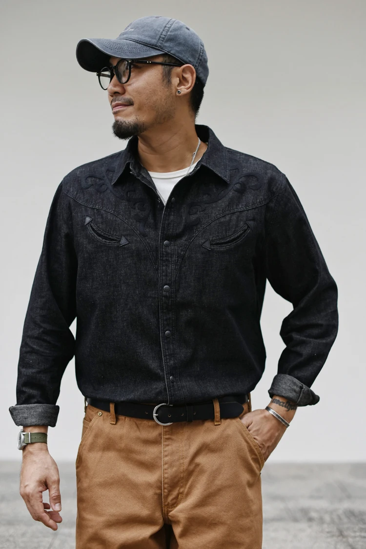 Sauce Zhan Men's Denim Shirt Linen Long Sleeve Shirt for Man Black Western-style Denim Shirt for Autumn Floss Silk Embroidery