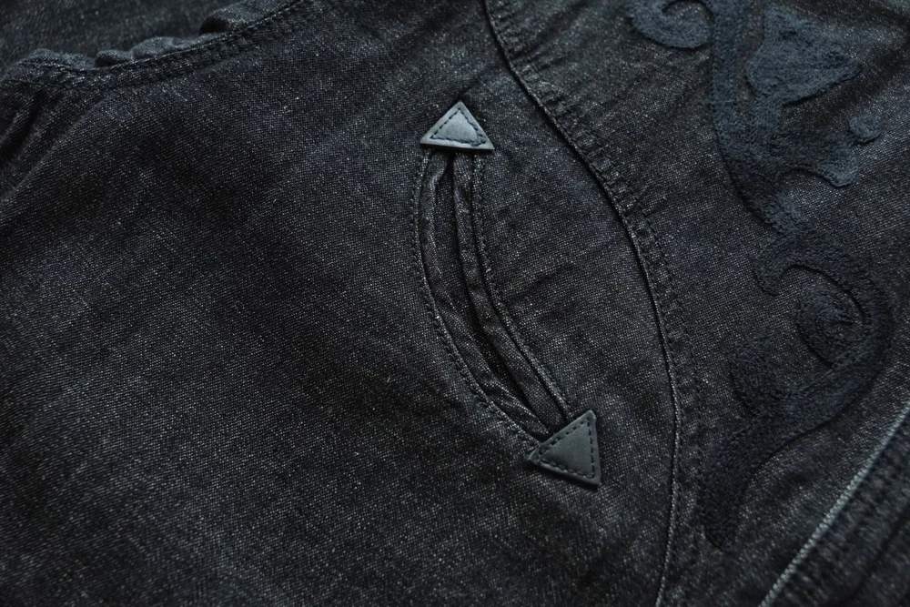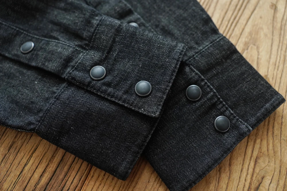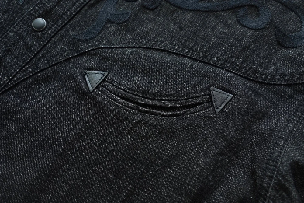 This is a refined black Western-style denim shirt, crafted with intricate detailing that pays homage to classic cowboy heritage. The unique chest pocket design captures authentic Western elements, making it a must-have for fans of the Wild West, Red Dead Redemption, or shows like Yellowstone.