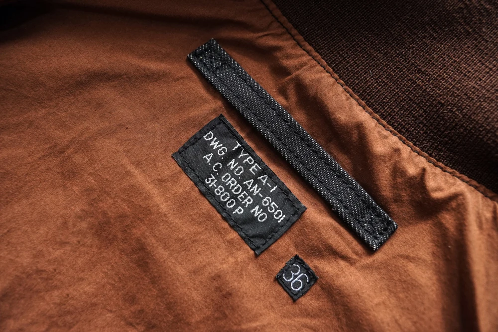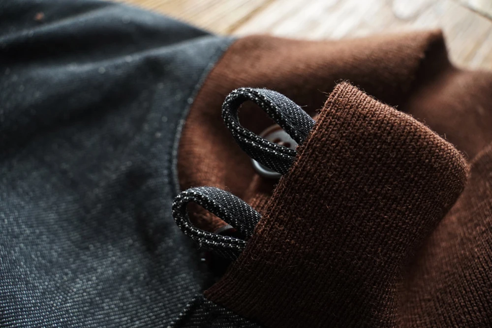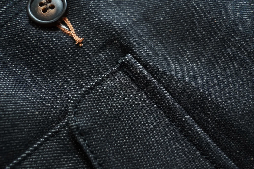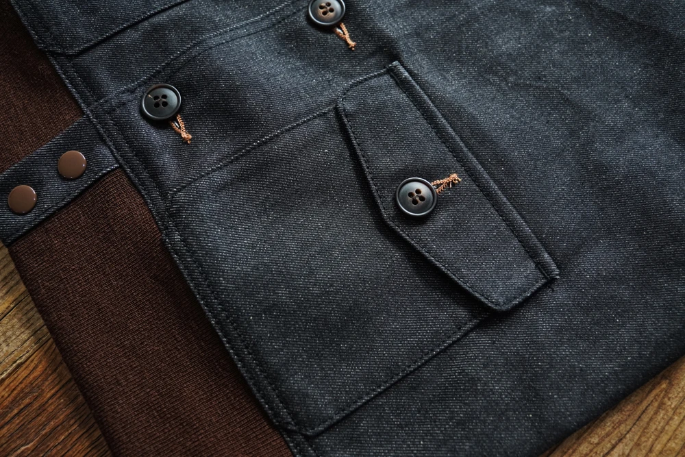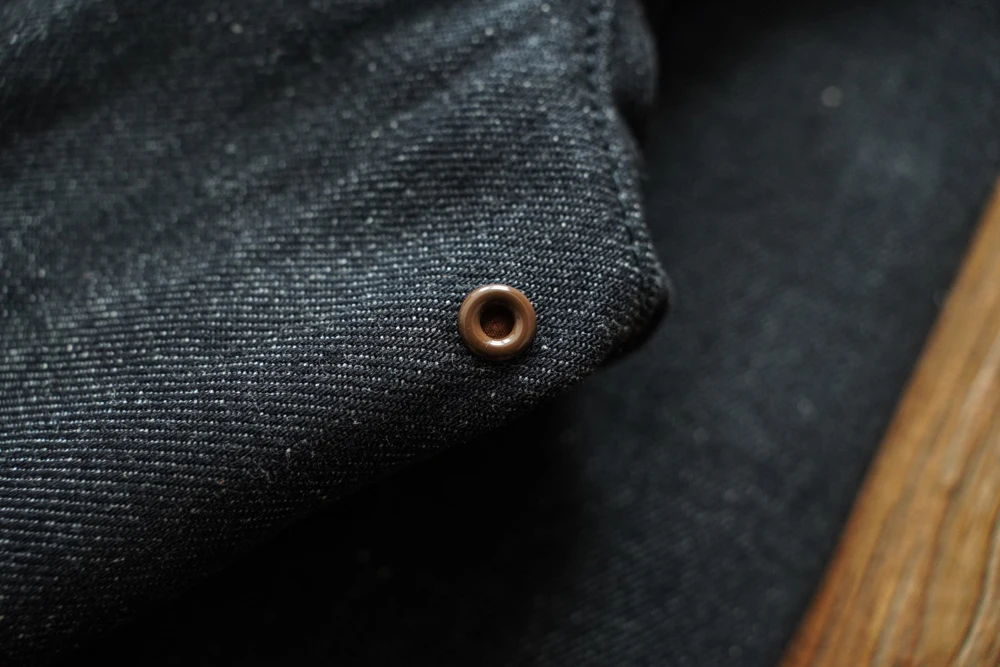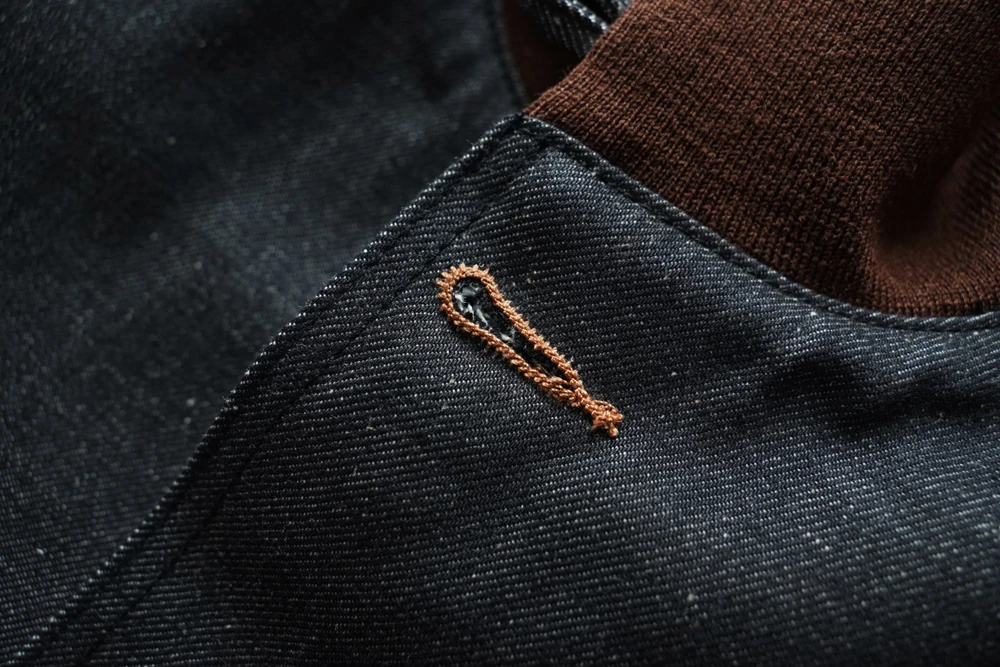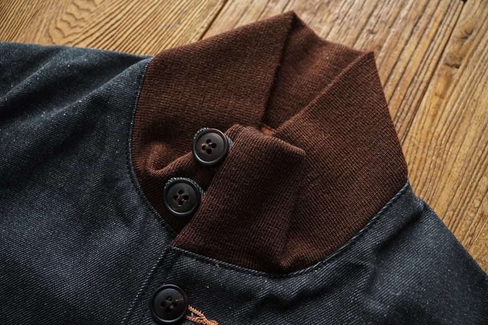 This jacket uses reactive-dyed denim fabric as a replacement for the original leather, while preserving the original details as much as possible. The reactive-dyed fabric is highly colorfast, with a rich and deep black tone. The fabric has a weight of 13.5 oz, and the selvedge edge is black. Just like the original leather version, the ribbing is made from 100% seamless wool, which is very costly. The ribbed sections are used at three key areas: the collar, hem, and cuffs.