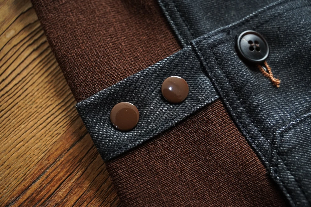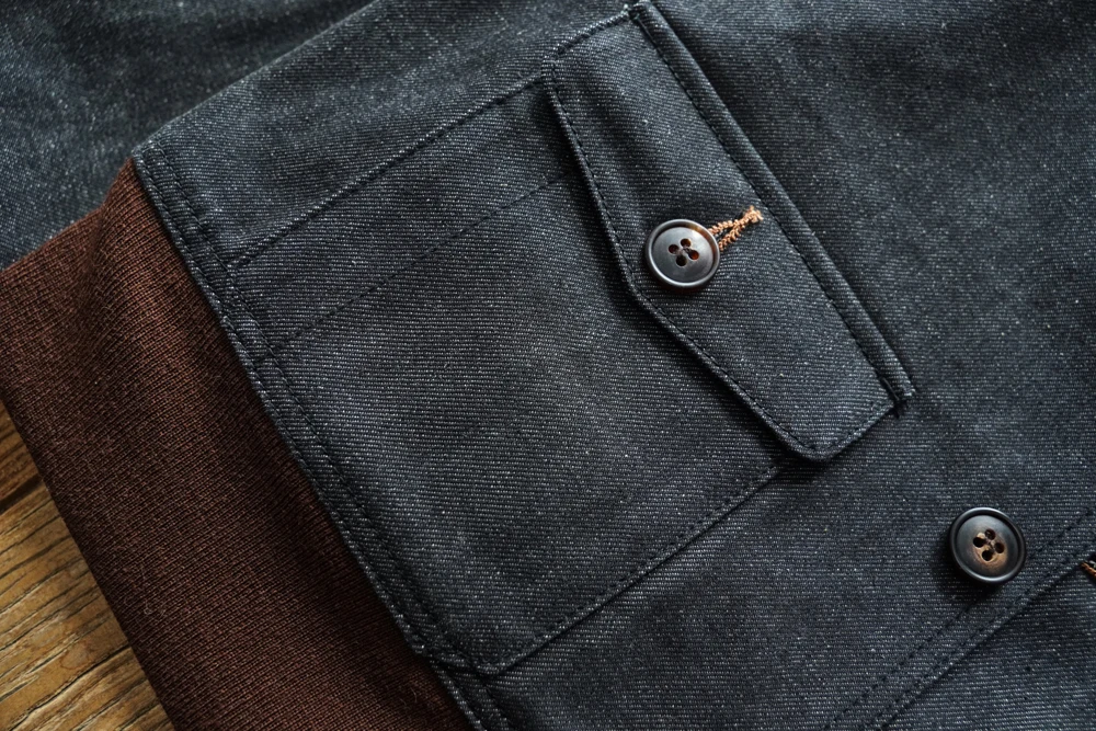 The front buttons are custom-molded horn buttons of the same specifications. Every aspect of the jacket, from the fabric to the accessories, uses high-quality materials, with most components requiring custom production to achieve the desired result.