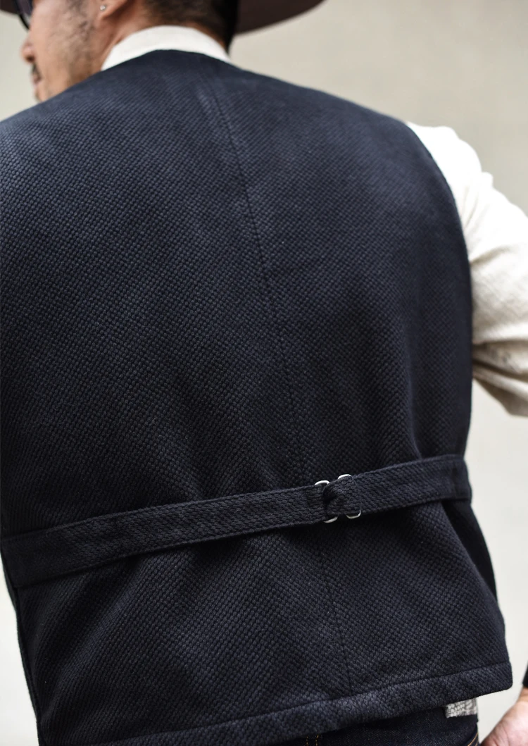 This vest is crafted from finely textured, thick sashiko fabric, using a high-fastness reactive dyeing process that resists fading. The buttons are made of brass, plated with a vintage matte silver finish, offering a classic touch. The back features an adjustable Paris buckle for a custom fit, enhancing comfort. The interior is lined and includes an inner pocket for added practicality. With its stylish design, this vest pairs beautifully with shirts, making it an excellent choice for everyday wear.