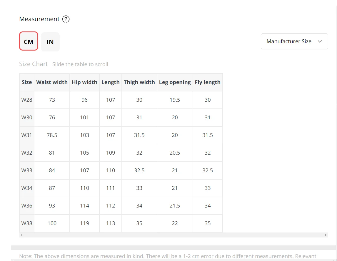 size_info: {"sizeInfoList":[{"length":{"cm":"73","inch":"28.74"},"size":"W28","vid":-72},{"length":{"cm":"76","inch":"29.92"},"size":"W30","vid":-73},{"length":{"cm":"78.5","inch":"30.91"},"size":"W31","vid":-74},{"length":{"cm":"81","inch":"31.89"},"size":"W32","vid":-75},{"length":{"cm":"84","inch":"33.07"},"size":"W33","vid":-76},{"length":{"cm":"87","inch":"34.25"},"size":"W34","vid":-77},{"length":{"cm":"93","inch":"36.61"},"size":"W36","vid":-78},{"length":{"cm":"100","inch":"39.37"},"size":"W38","vid":-79}]}